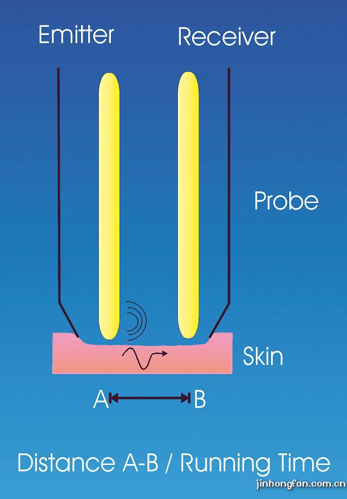 測試原理是基于共振聲波傳播時間的測量。測量時探頭內部的兩個針狀傳感器放置于被 測皮膚表面,一個傳感器發出一個聲音沖擊波信號,另一個傳感器接收此聲音沖擊波信號。 由于皮膚表面的水份和彈性的不同,造成聲音沖擊波傳播的速度不同,傳播的時間也不同。 這樣就可以測出在不同的皮膚水份和彈性狀況下聲波的傳播時間。彈性越好、水份充足、皺 紋少的皮膚,其傳播時間就越短。反之,彈性越差、缺水、皺紋多的皮膚,其傳播時間就越 長。在同一個皮膚位置的不同方向進行測試,還可以判斷出皮膚的纖維組織方向。